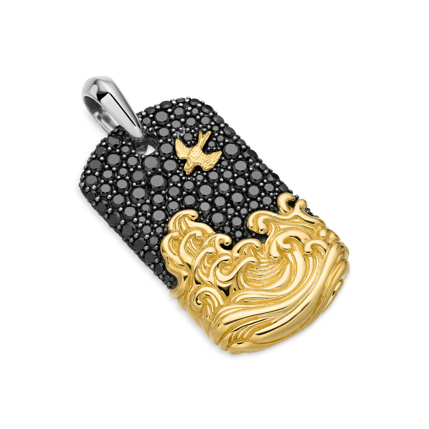Waves Tag in Sterling Silver with 18K Yellow Gold and Black Diamonds, 39mm | Leonardo's Jewelers
