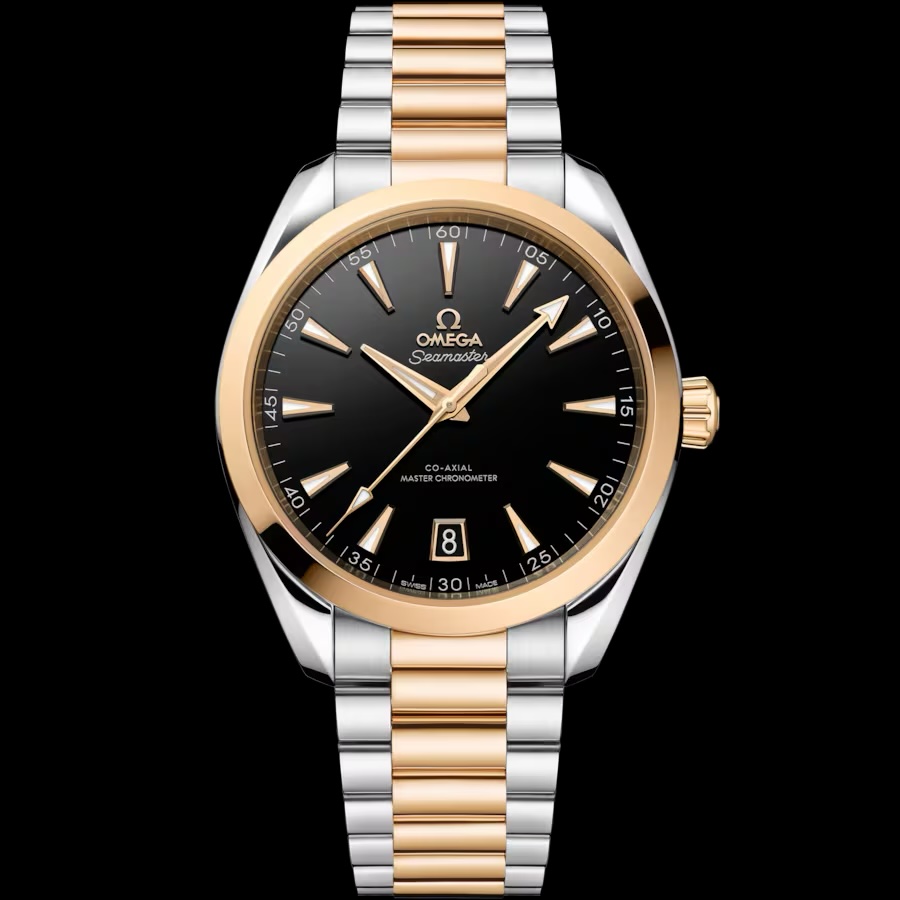 Omega seamaster aqua terra 41mm (150m), in moonshine gold and stainless steel with a black varnish dial. Carries the self-winding omega 8900 movement with a 60 hour power reserve and 5 year warranty.