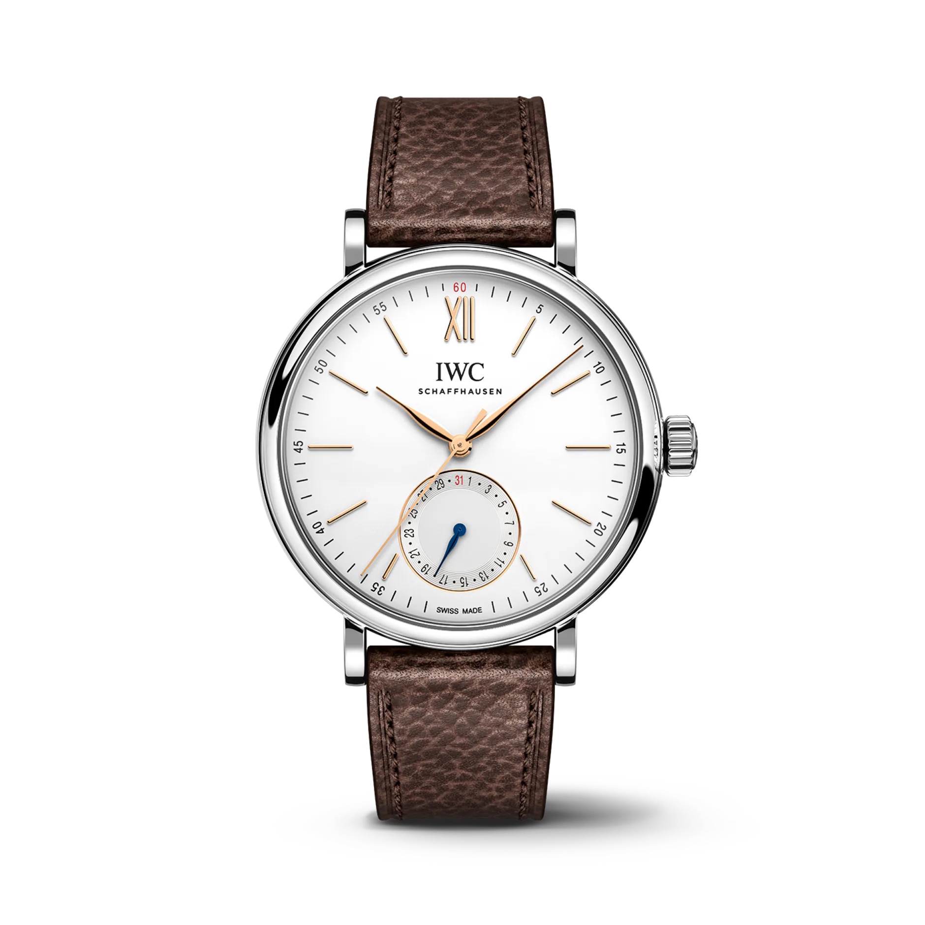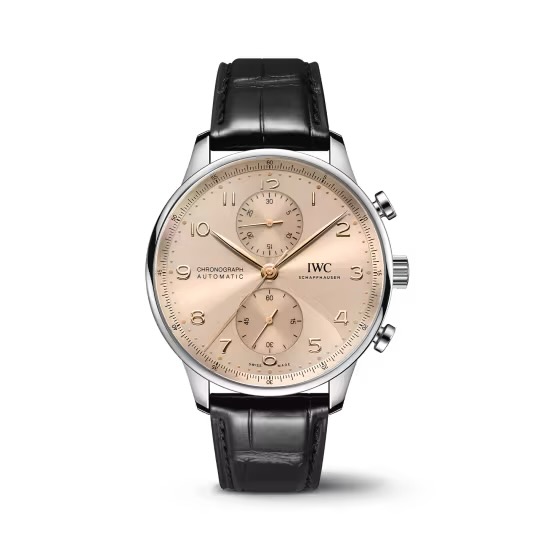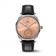 Iwc portugieser automatic 40 stainless steel case, automatic, self-winding, diameter 40.4 mm, salmon dial black alligator leather strap, strap width 20.0 mm. made in switzerland.