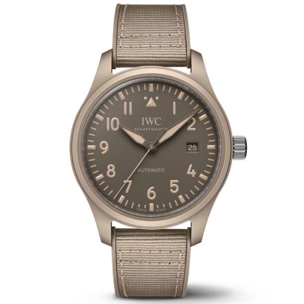 Iwc pilot's watch automatic 41 top gun mojave desert model no. Iw328106 brown dial beige rubber strap with textile inlay strap, 120 hours automatic winding, iwc-manufactured movement 10.0 bar (100m).
