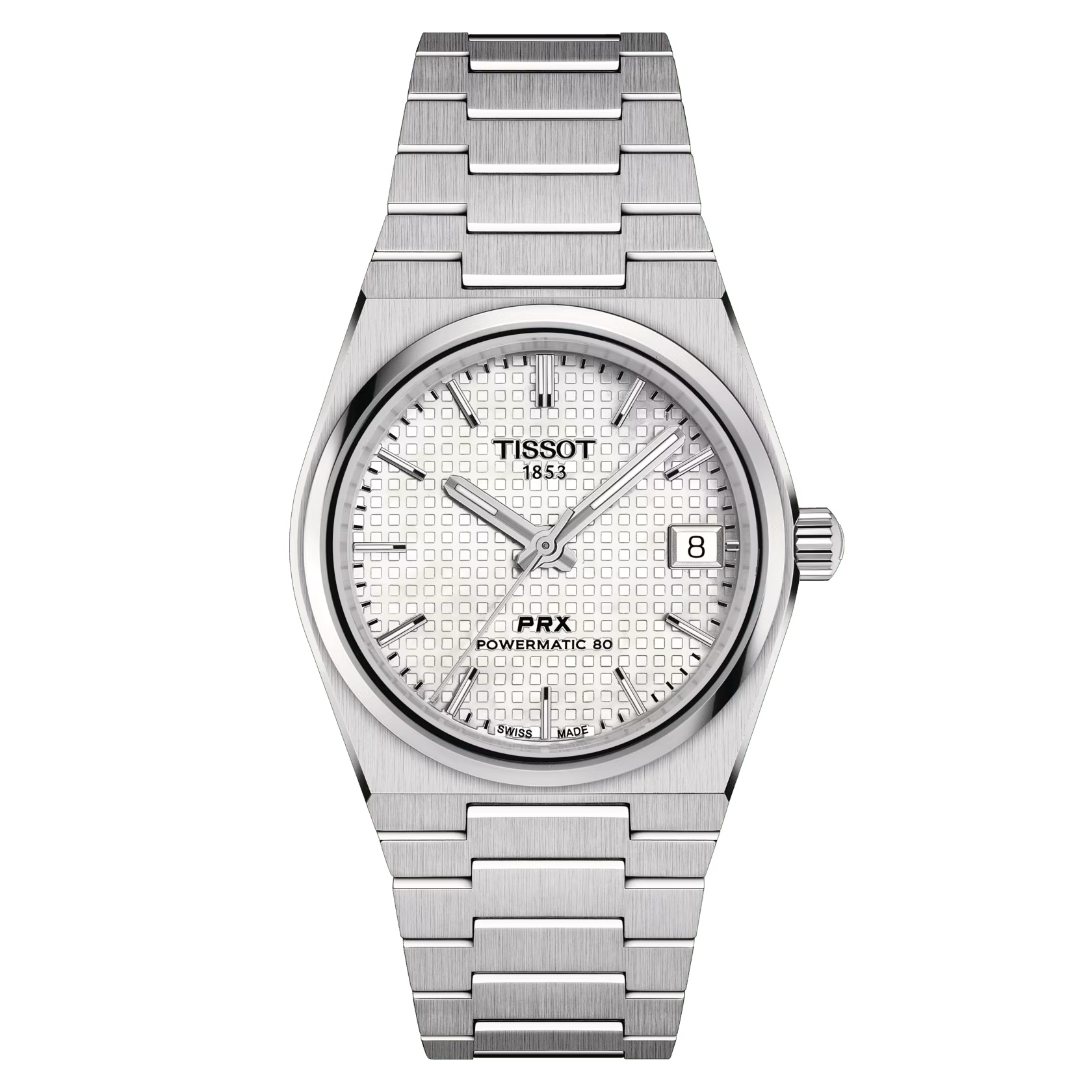 Tissot prx powermatic 80 35mm automatic watch with a white mop dial in stainless steel on a steel bracelet. 80 hour poerr reserve. .